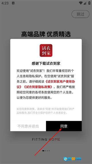 1、在试衣到家的服务协议弹窗中,点击同意,进入应用页面。