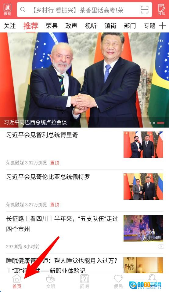 1、首页呈现最新推荐的资讯和要闻,点击下方的首页按钮能够随时回到主界面。