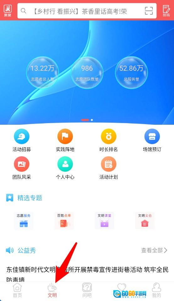 2、点击文明标签可进入志愿服务专区,查看活动招募、排名及个人中心等内容。
