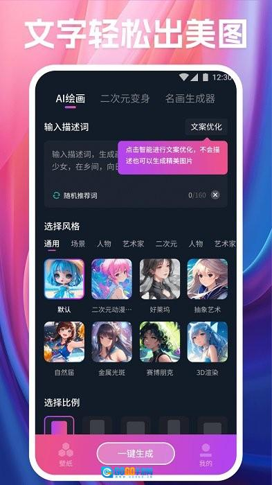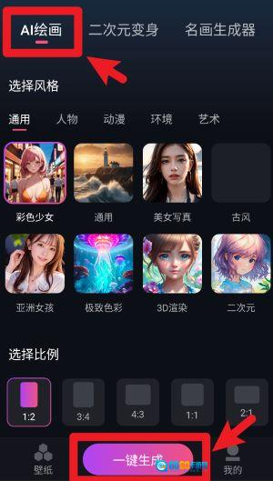 3、进入创作页面后,选择AI绘画功能,能够自行设置风格与比例,点击一键生成按钮即可快速制作出作品。