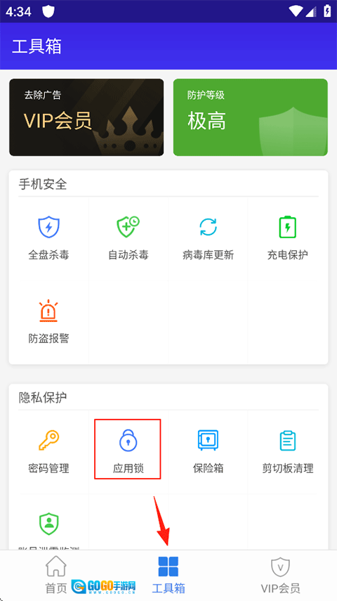 1、启动猎豹安全大师应用,接着依次点击工具箱、隐私保护选项,最后进入应用锁功能。