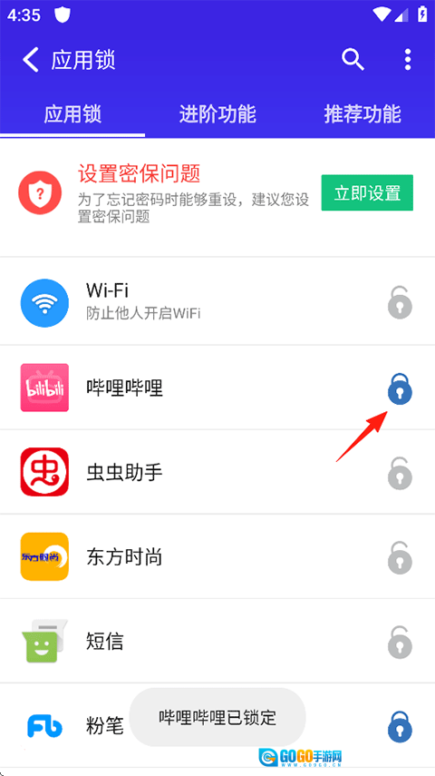 3、进入后点击右侧的锁定图标就能完成上锁操作,另外还可以点击上方的设置按钮添加密保问题,以防忘记密码。