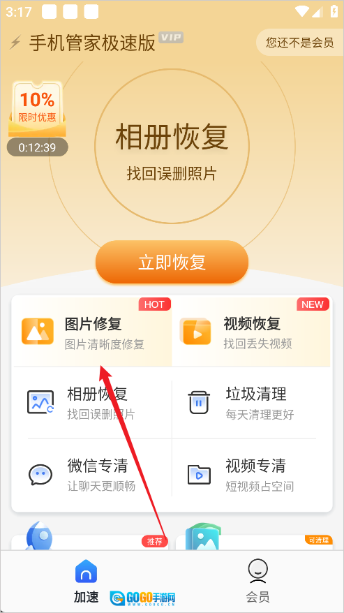 1、安装手机管家极速版2026最新版本,然后在首页找到并选择“图片修复”功能;