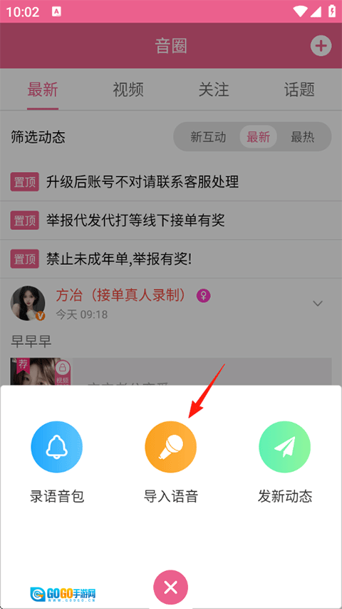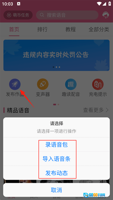 3、还有一种方法:在首页点击发布作品,接着在弹出的列表中选择导入语音条。