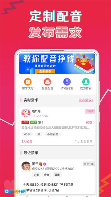 4、需求大厅:支持发布配音需求,浏览作者试音作品,筛选并选择心仪的音色。