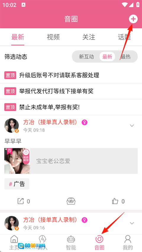 1、打开萌配音应用,在首页找到并点击“音圈”选项,接着点击页面右上角的加号图标;