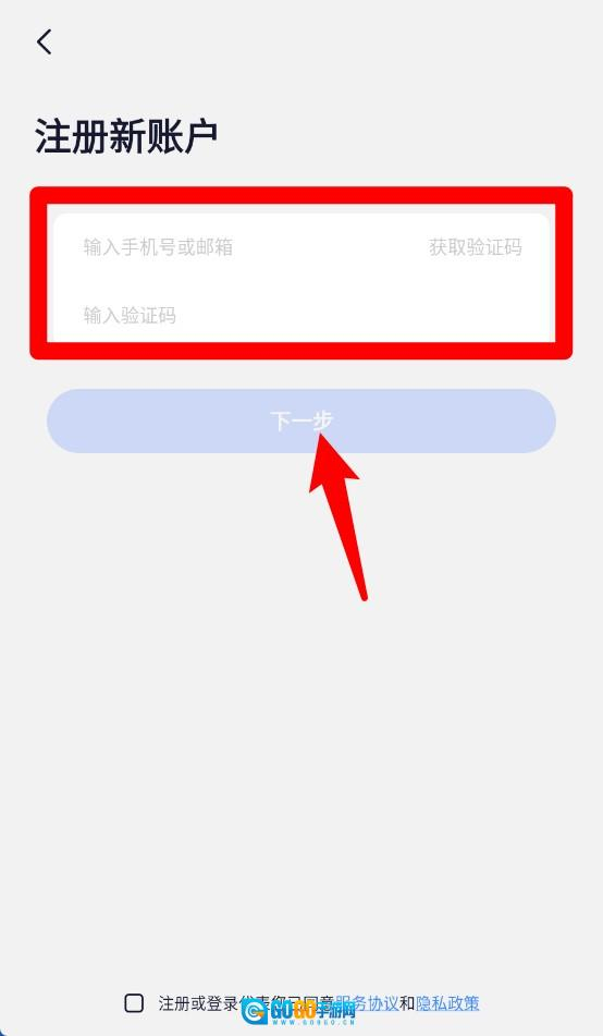 1、在注册界面输入手机号或电子邮箱,填写对应的验证码后点击下一步,即可完成账号注册流程。