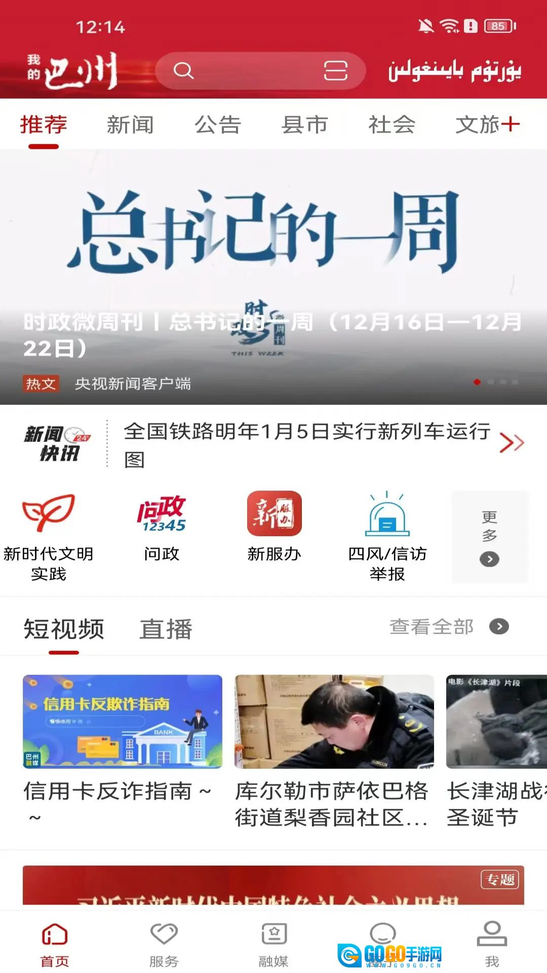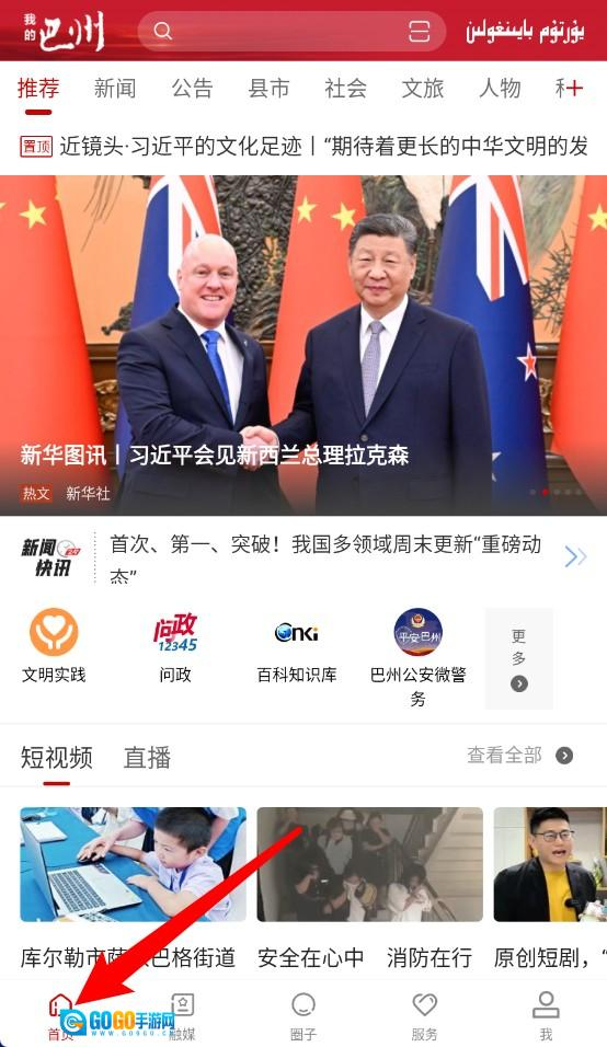 1、首页设有推荐资讯、政务服务与短视频板块,可供用户浏览本地重点新闻动态。