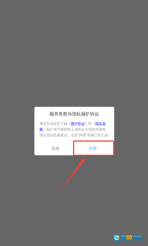 1、阅读服务条款后,点击红框箭头指向的同意按钮。