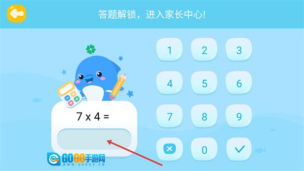 2、当遇到【答题解锁-进入家长中心!】这一环节时,需要完成算式题(例如计算【7×4】),算出结果后在输入框中填写并确认。