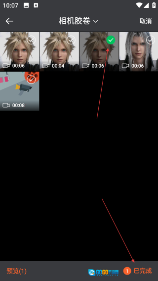 3、进入相机胶卷页面后,先【选中视频】,再点击【已完成】按钮,即可进入格式设置的操作界面。
