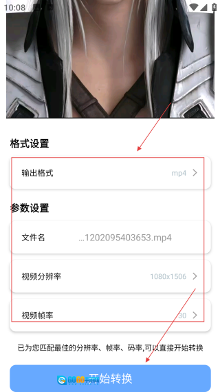 4、进入格式设置页面后,先对参数进行确认,接着点击【开始转换】按钮,这样就能完成视频格式的转换操作了。
