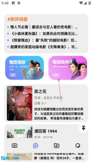 2、在互动模块页,点击【看图猜演员】选项,进入演员人物的猜题界面。