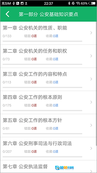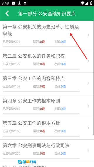 3、进入该部分页面后,会显示各章节的列表,点击【第一章-公安机关的历史沿革、性质及职能】即可进入相应章节进行练习。