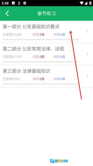 进入章节练习页面后,会呈现出【第一部分-公安基础知识要点】等不同板块,点击相应板块即可进入该知识模块进行练习。
