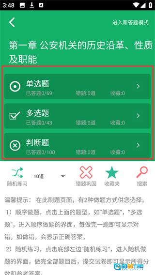 进入相应章节后,你可以选择【单选题】等题型进行练习,也能借助【随机练习】功能根据自身需求刷题,此外还有答题方式提示为你提供辅助。