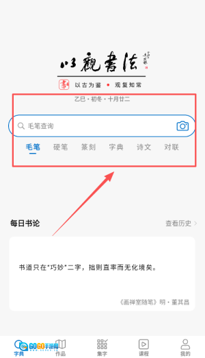 1、首先并安装观书法App,注册后进入主界面,用户可以轻松找到汉字查询和书法展示的功能,获取丰富的书法资源。