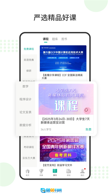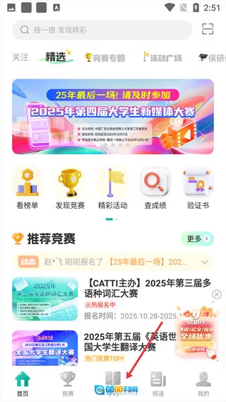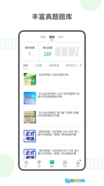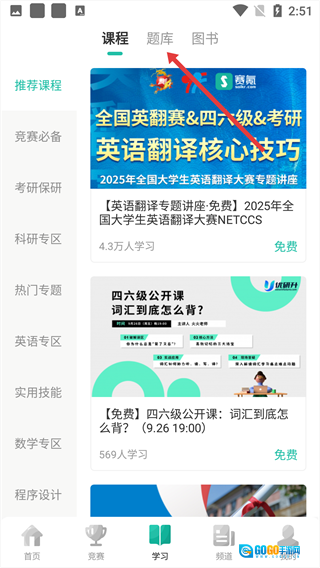 2、在学习页面顶部的标签栏里,点击“题库”标签,就能进入题库资源的列表页面。