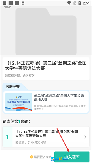 4、信息确认无误后,点击“加入题库”按钮,即可完成该题库的添加流程。