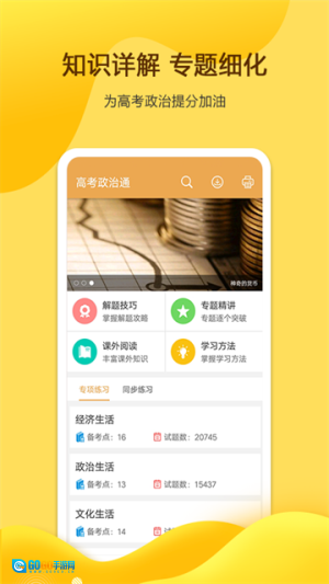高考政治通聚焦高中政治学习,涵盖所有高考知识点,分为经济文明、政治生活、文化生活、生活与哲学等主要模块。应用提供详细的专题练习题和分析,包含解题技巧、专题讲解和学习方法,帮助学生备考更轻松,提升学习效果。