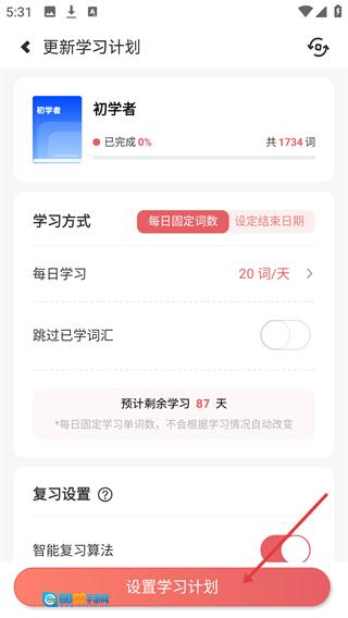 4、进入【更新学习计划】页面后,点击页面底部的【设置学习计划】按钮,即可完成学习计划的创建。