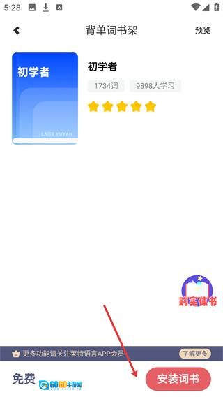 2、进入【背单词书架】页面,找到已选定的【初学者】词书,点击底部的【安装词书】按钮。