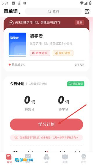 3、进入背单词页面后,找到已安装的【初学者】词书,点击页面上的【学习计划】按钮,就能进入学习计划的设置界面。