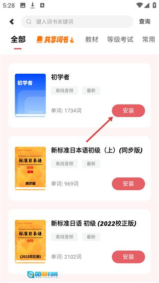 1、打开词书列表页面,找到【初学者】词书,点击它旁边的【安装】按钮。
