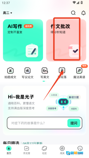 4、通过批改功能检测文章问题,查看语法纠错和结构评分,根据反馈修改提升质量。