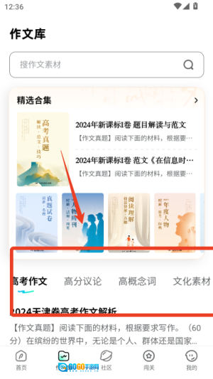 2、素材检索功能提供分类检索与关键词搜索双模式,快速定位所需范文与写作案例。