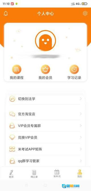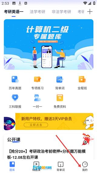 1、进入包含【历年真题】【专项练习】等功能的题库页面,找到底部的【我的】按钮并点击,可进入个人相关页面。