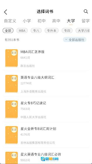 3、多阶段词库支持:涵盖小学、中学、大学四级、六级直至考研、雅思、托福等各学习阶段的词汇资源,可适配不同用户的多样化需求。