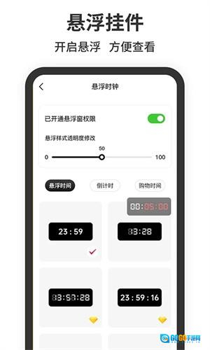 2、悬浮时钟:拥有多样的主题样式,秒表与时钟功能都能适配使用。