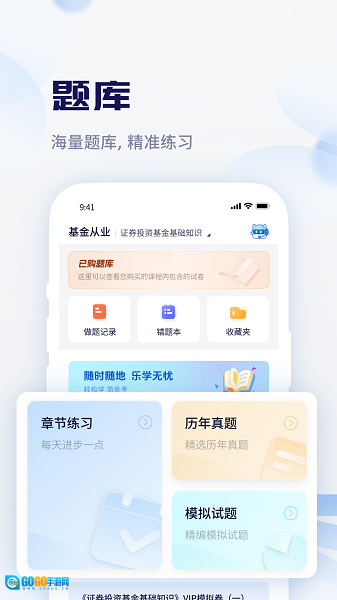 3、智能题库:拥有超百万道真实与模拟题目,可提供章节练习、错题纠正以及模拟考试测评功能。