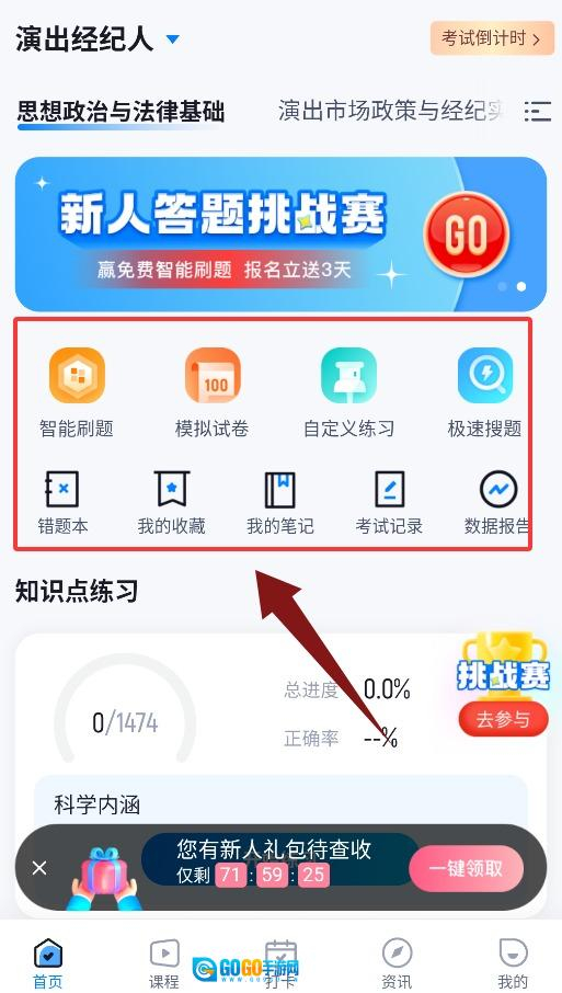 3、首页提供智能刷题、模拟试卷、自定义练习与极速搜题功能。