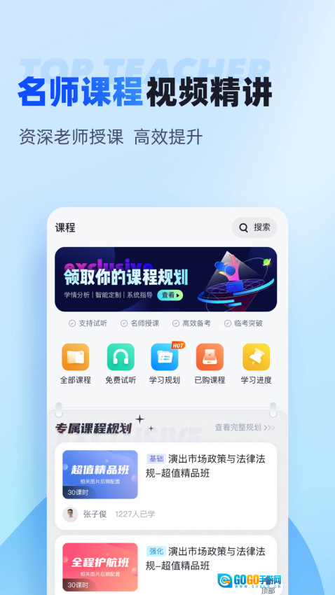 1、智能课程推荐根据用户报考方向智能推荐匹配的课程资源,提供免费试听与完整课程购买选项,支持课程收藏与学习进度跟踪。