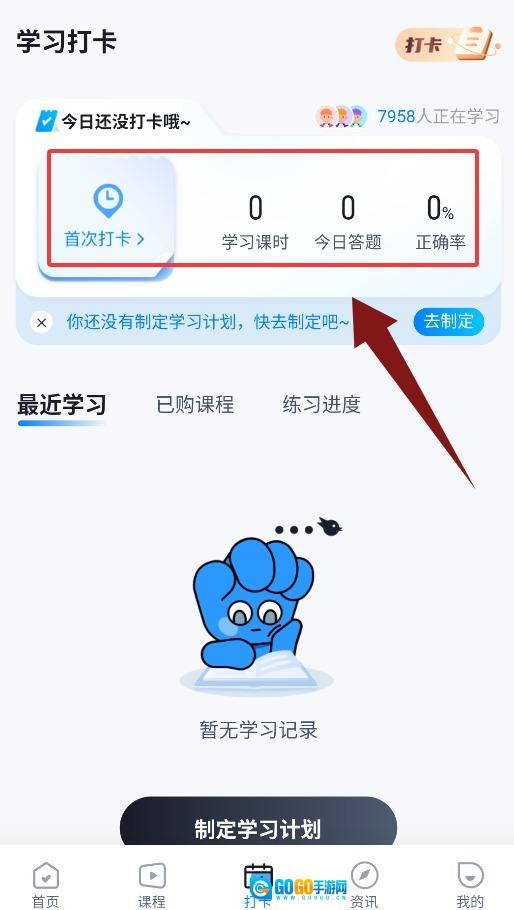 4、打卡界面支持首次打卡、学习进度统计、今日答题与练习记录。