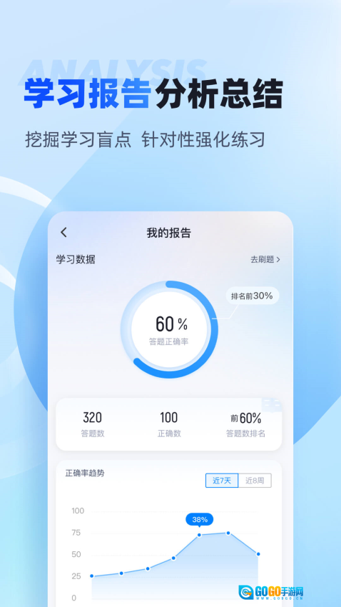 4、学习进度可视化通过图表清晰展示各科目的学习时长、练习数量、正确率变化、薄弱知识点分布等关键数据,帮助用户客观评估备考进展。