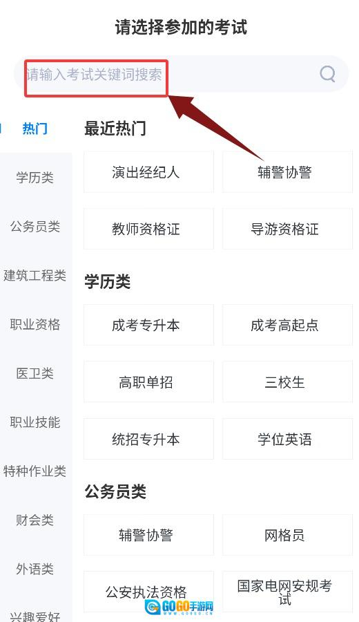2、进入后需选择参加的考试,可通过关键词搜索栏进行查找。