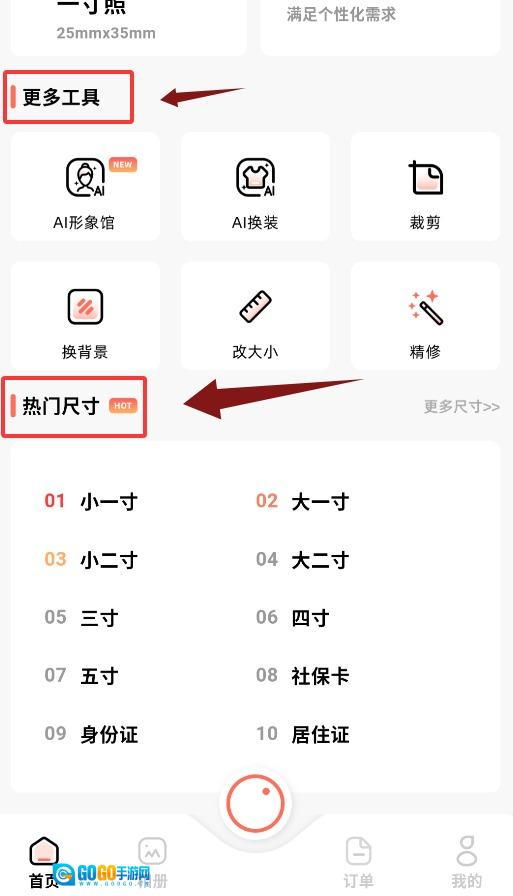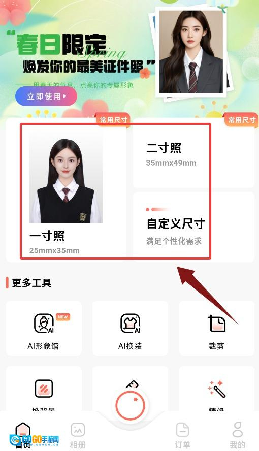 2、首页配备一寸照、二寸照以及自定义尺寸等多种照片规格功能。
