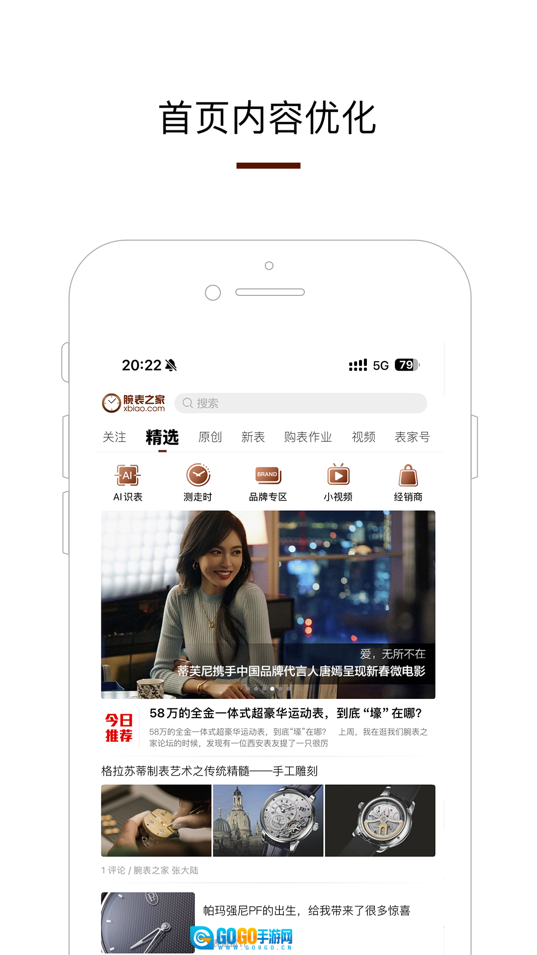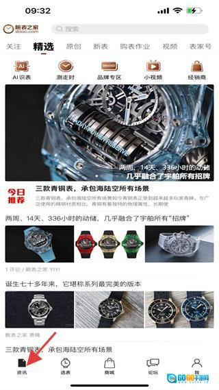 1、资讯板块,推精选腕表内容,如三款青铜表承包海陆空场景,还有两周动力的腕表资讯,呈现腕表动态与推荐。