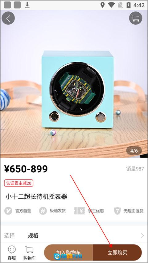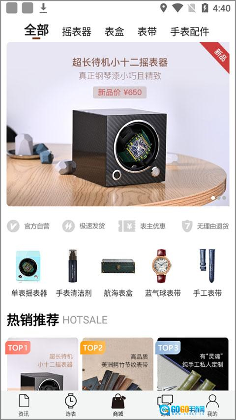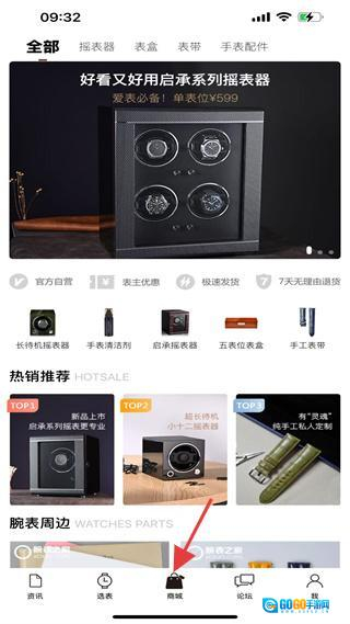 3、商城板块主推摇表器等腕表周边,有热销推荐的表盒、表带等,提供自营、7天无理由退换等服务,助力腕表周边选购。
