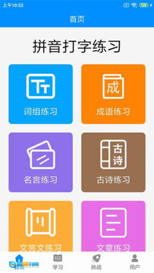 1、用户首先要安装拼音打字练习类应用,进入主界面后能浏览到多种练习模块,挑选合适的学习内容来帮助自己更快熟悉操作。