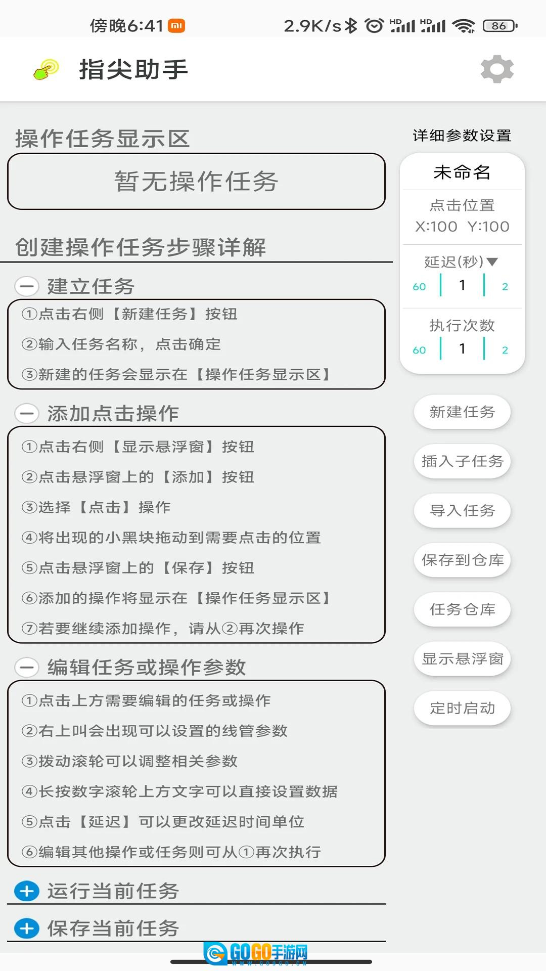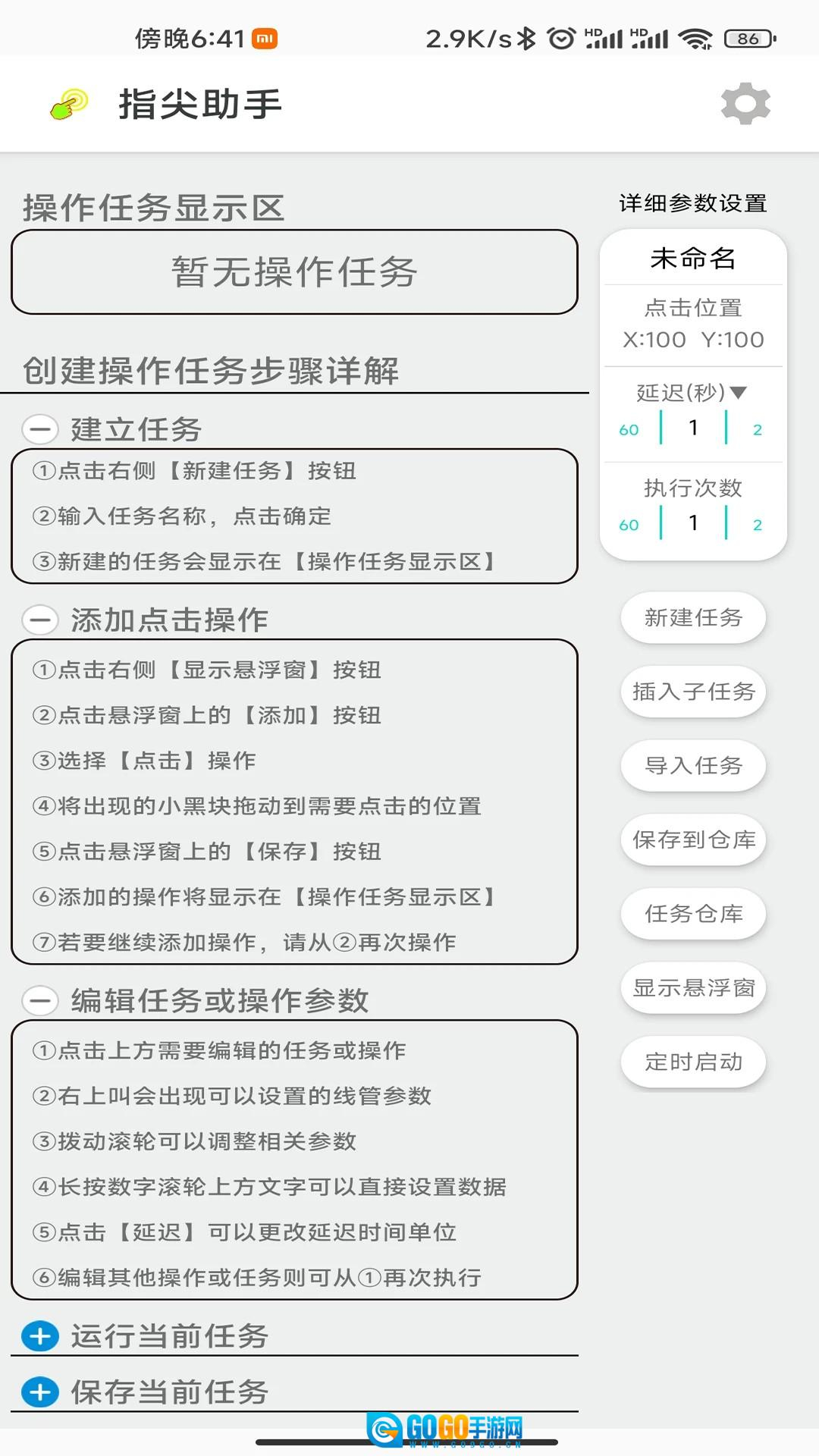 指尖助手是一款非常优秀的自动点击辅助软件,拥有全新的点击辅助功能,用户可以直接设置各种点击任务,包括抢红包,点赞等操作,自由享受便携的点击过程,还拥有个性化的界面设计,无需开通任何权限即可上手进行点击,能完全满足所有使用需求,还允许用户直接设置各种点击时长,参数等数据,给用户带来自动化的点击服务,还具有实时点击模式,可以自由设置切换,随时轻松进行编辑调整,有需求的用户欢迎来本站软件吧。