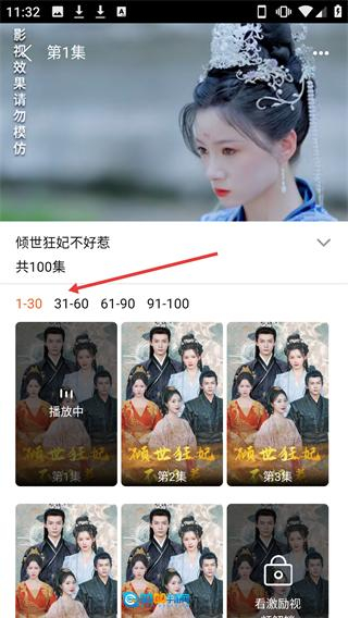 4、在集数选择列表中点击集数选项,可切换到该区间的集数选择。