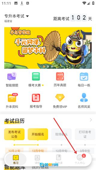 1、在专升本考试【练习】界面,点击底部【个人中心】选项,可进入对应的个人中心页面。