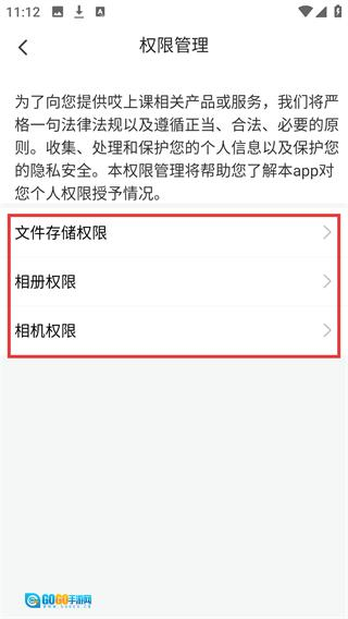 4、进入【权限管理】页面后,可查看并管理【文件存储权限】【相册权限】【相机权限】等应用相关权限。