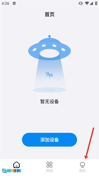2、进入首页看到【暂无设备】提示,可点击【添加设备】按钮关联设备,底部点击【我的】进入个人中心页面。