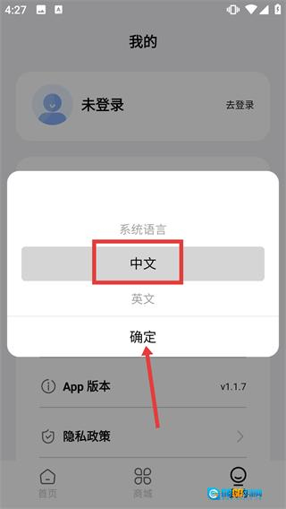 4、在语言选择弹窗中,选择【中文】选项后,点击【确定】按钮,即可完成软件语言的设置操作。