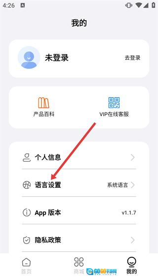 3、在【我的】页面,找到【语言设置】选项,当前显示【系统语言】,点击该选项可进入语言选择界面。